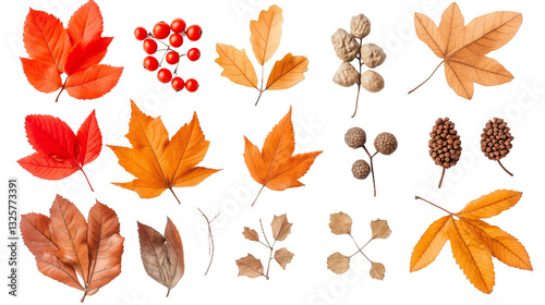© Leo, Obraz premium Autumn Arrangement of Dried Leaves and Rowan Berries, Symbolizing Nature's Seasonal Transition. png file of isolated cutout object with shadow on transparent background.