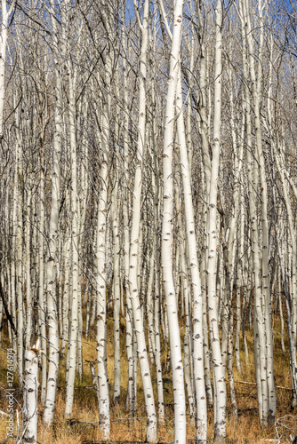 © knowlesgallery, Fototapeta premium Autumn Aspen forest with white bark and blue sky