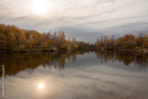 © Onty, Fototapeta premium Autumn at pond in evening