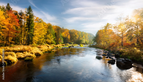 © Carlie, Obraz premium Autumn At The Forest River In Sunny Day