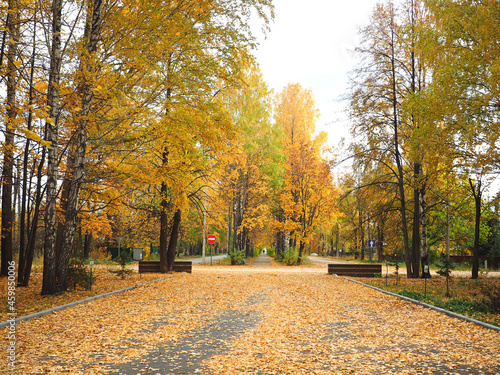 Naklejka premium Autumn. Autumn park, alley in a small town. Russia, Ural, Perm region