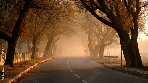 © Grzegorz, Fototapeta premium Autumn Avenue Silhouette with Soft Amber Glow