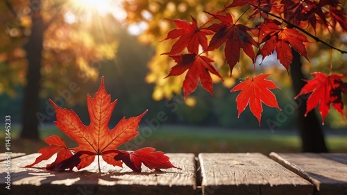 © narumiaegis, Obraz premium Autumn background scene with red maple leaves on table with sunlight.