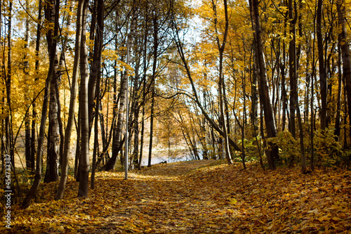 © natalialeb, Fototapeta premium Autumn background. Trail paths in forest city park Golden foliage in autumn park