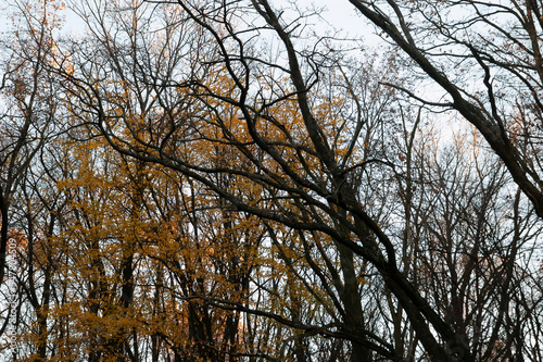 © green_flame, Obraz premium Autumn background: trees, with autumn leaves and bare, against the sky