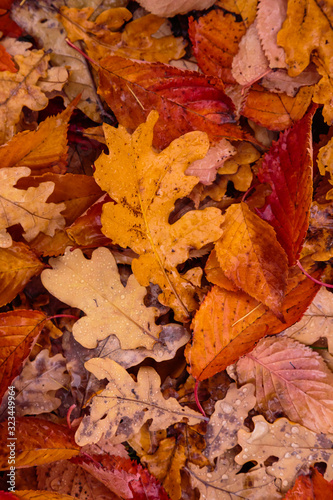 © Flower_Garden, Fototapeta premium Autumn background with fallen leaves of yellow, red autumn leaves