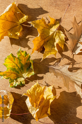 © 201122, Obraz premium Autumn background with yellow leaves. The bright rays of the sun.