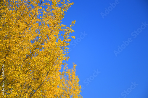 Fototapeta premium Autumn background with yellow tree and blue sky.