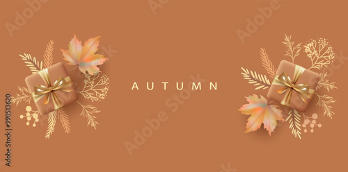 Obraz premium Autumn banner with maple leaves and and gifts. Abstract fall background