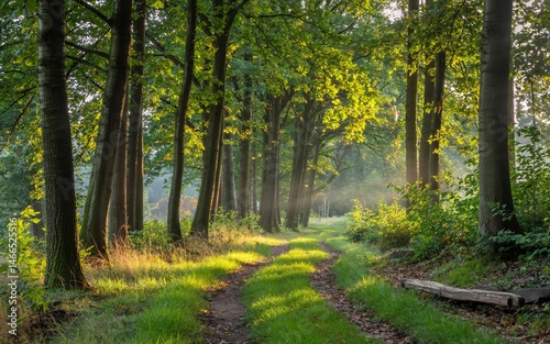 © BackgroundStudio, Fototapeta premium Autumn Bavaria, Germany, Sunlit Forest Path at Dawn