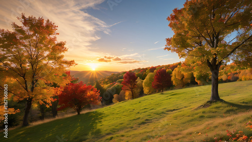 © Munchy Moods, Fototapeta premium Autumn beauty at its finest. A breathtaking landscape of vibrant fall colors against a backdrop of a golden sunset.