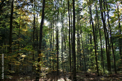 © Monika, Fototapeta premium Autumn beech forest in the rays of the setting sun