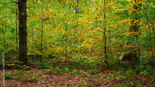 Obraz premium Autumn Beech Tree Saplings in Gosforth Park, located north of Newcastle in Tyne and Wear this woodland is popular with dog walkers and gives a rural setting in an urban area