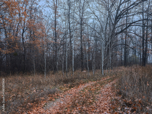 © olegkruglyak3, Obraz premium Autumn birch forest with dirt path