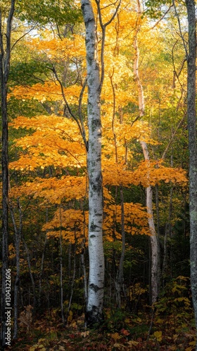 © Kenny, Fototapeta premium Autumn birch trees and vibrant foliage in sunlit forest