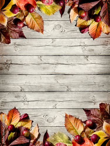 © iravgustin, Naklejka premium Autumn border from apples and fallen leaves on old wooden table