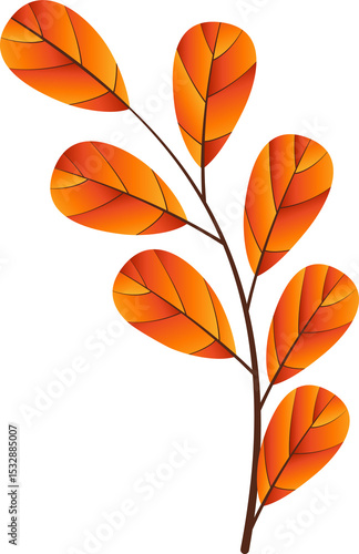 Fototapeta premium Autumn branch is showing seven gradient orange-red leaves in flat vector on transparent background