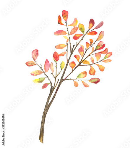 Fototapeta premium Autumn branch of watercolor blueberry isolated on a white background. North of the plant. Shrub, tree. Fall