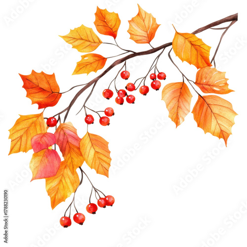 Fototapeta premium Autumn Branch Watercolor: A vibrant watercolor illustration showcases an autumn branch, adorned with fiery orange and red leaves and complemented by clusters of bright berries.