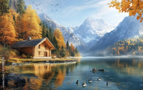 Fototapeta premium Autumn cabin by a lake, mountains in background, peaceful scene (1)