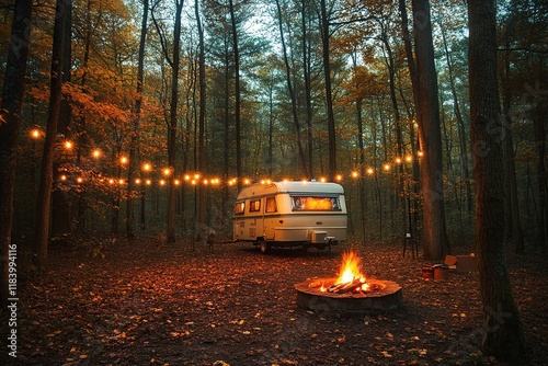 Obraz premium Autumn Camping: Trailer in Woods, Campfire & Fairy Lights, Peaceful Forest Escape.