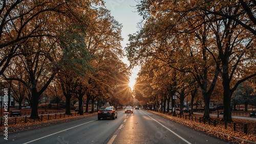 Fototapeta premium Autumn Central Park transverse road sunset, yellow cabs passing under golden canopy, realistic fall foliage textures.