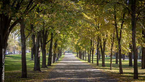 Naklejka premium Autumn city street, yellow foliage in the trees and the sidewalk