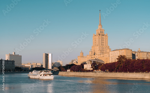 © skyNext, Obraz premium Autumn cityscape on sunny evening: Moscow river with touristic ship on it, historical hotel building calling "Stalin's skyscraper" with spire, governmental white house in background on the left