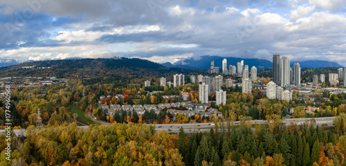 Naklejka premium Autumn Cityscape Over Burnaby and Vancouver: Highrise Skyline Amid Forested...