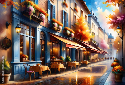 Fototapeta premium Autumn cityscape, small cafes line the street, trees with bright leaves, street lamps shine with warm light.