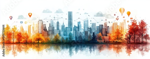 Fototapeta premium Autumn cityscape with skyline, trees, and digital data connections