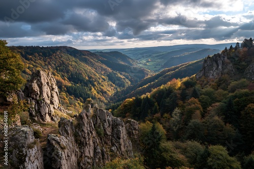 © Sidra, Obraz premium 1. Autumn cliffside with forests cascading down into valleys, dramatic sky above