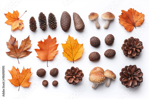 © VazzBee, Obraz premium Autumn collection of pinecones and leaves