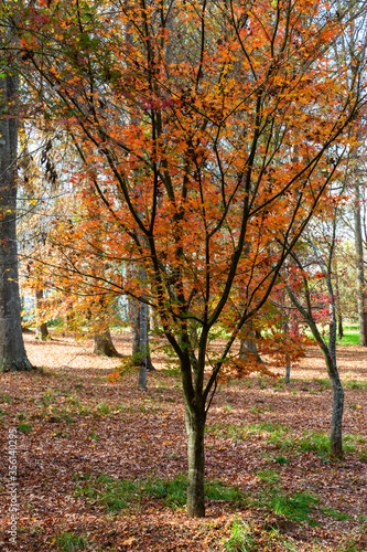 Naklejka premium Autumn colored leaves on the tree and the ground