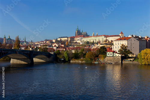 Naklejka premium Autumn colorful Prague Lesser Town with gothic Castle above River Vltava in the sunny Day, Czech Republic
