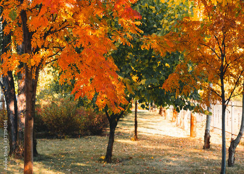 © Natali, Fototapeta premium Autumn colorful yellow and orange leaves in park. Beautiful yellow maple leaves on sunny day and blurry background. Golden autumn in city park. Close up, macro shot. Fall Scene.