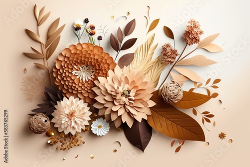 © shehbaz, Fototapeta premium Autumn composition made of beautiful flowers on a light background. Floristic decoration