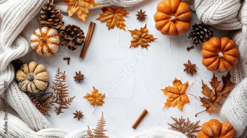 © Heinan Drawings, Fototapeta premium Autumn composition, warm blanket, miniature pumpkins, golden leaves, pine cone