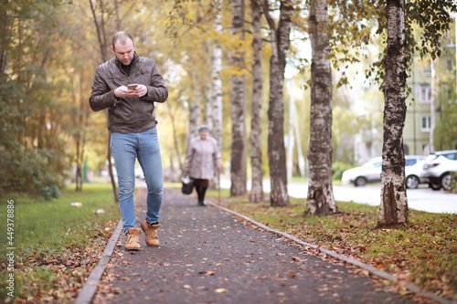 © alexkich, Fototapeta premium Autumn concept. A man walks through the city. Autumn leaves on the footpath.