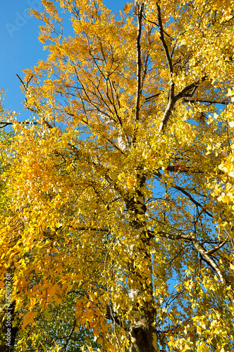 © Yuliya Kiyko, Obraz premium Autumn crown birch tree yellow leaves on a background of blue sky.