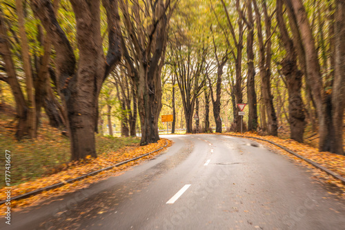 © puhimec, Fototapeta premium Autumn curved road through forest trees. Golden leaves on asphalt.