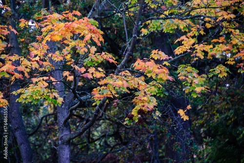 © Sourav Saha, Fototapeta premium Autumn Fall Colors Landscape with Red Yellow and Green Trees Reflected in Calm Water | Colorful Foliage, Reflection, and Serene Nature Scene Showing Seasonal Beauty of Fall