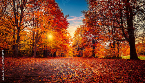 Fototapeta premium Autumn fall leaves through the trees yellow orange red landscape