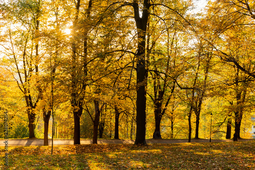 Fototapeta premium Autumn, Fall scene. Beautiful Autumnal park with pathway. Beauty nature scene.