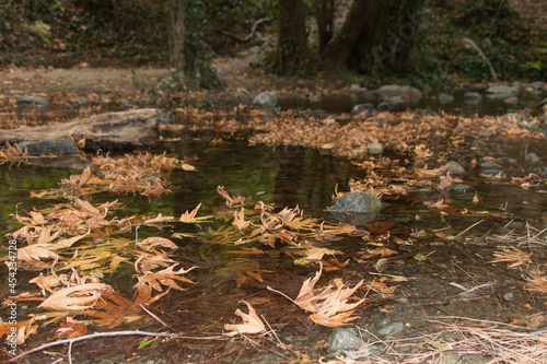 Fototapeta premium Autumn fallen leaves floating on a small forest river. Blurred background.