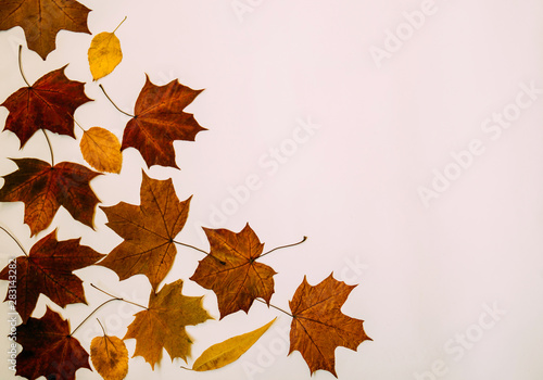 Fototapeta premium Autumn falling leaves and copyspace for text on pastel background.