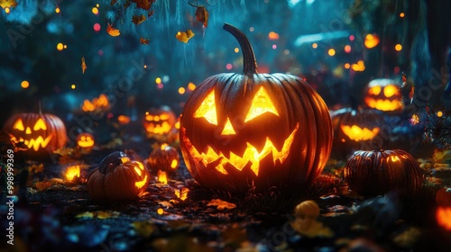 Fototapeta premium Autumn festival with illuminated carved pumpkins and jack o lanterns
