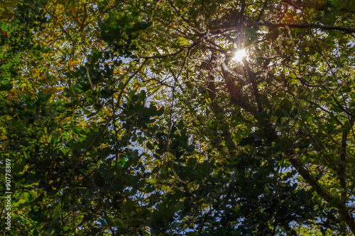 Fototapeta premium Autumn first yellow leafs in sun light background