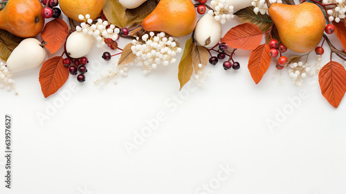 © hassanmim2021, Naklejka premium Autumn floral frame, web banner, Garland of berry eucalyptus leaves, branches, pear fruit. Generative Ai