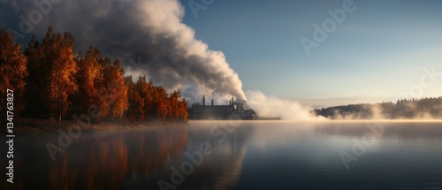 © iskar suhadi, Obraz premium Autumn Fog Over Lakeside Factory